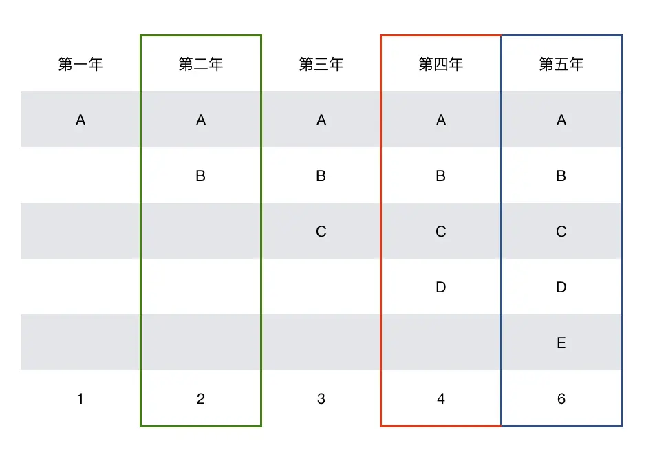 第五年 = 第四年存活的 + A与第二年出生的B所生的两个