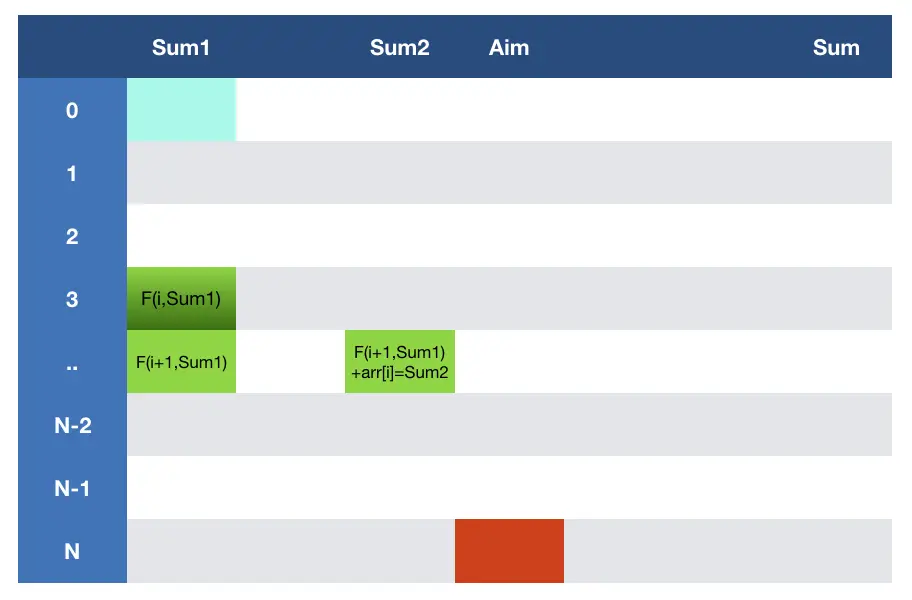 某一个位置F(i,sum1)的状态依赖于F(i+1,sum1)与F(i+1,sum1)+arr[i]