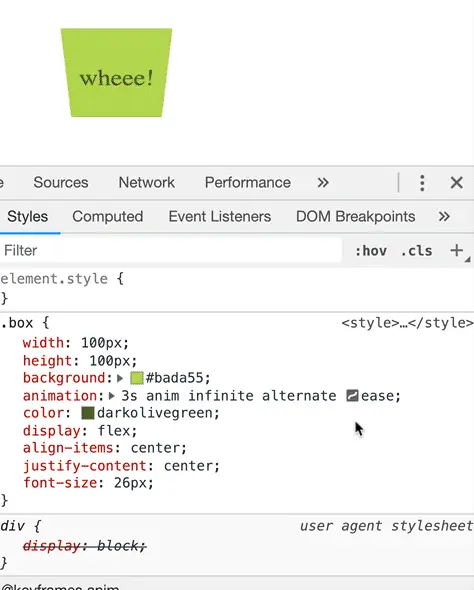 就像之前说的 Color picker 和 Shadow editor 一样直接点击我们刚刚提到的属性(或者他们的简写形式:trasition, animation - 请注意:如果 timing 函数的值没有设置在这个简写的形式中,这个符号不会显示出来)边上的曲线符号: