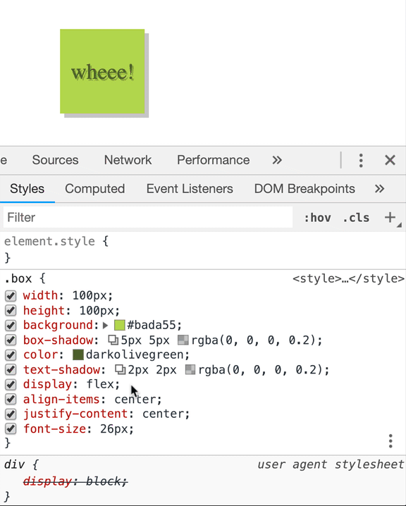 听起来很不吉利 (译者注:阴影哪里不吉利了!) ,但是它只是一个小部件而已,就像我们前几天聊过的 color picker 一样,但是它更加简单。可以通过在 Style 面板中点击靠近 box-shadow 属性或 text-shadow属性的阴影方形符号来打开它: