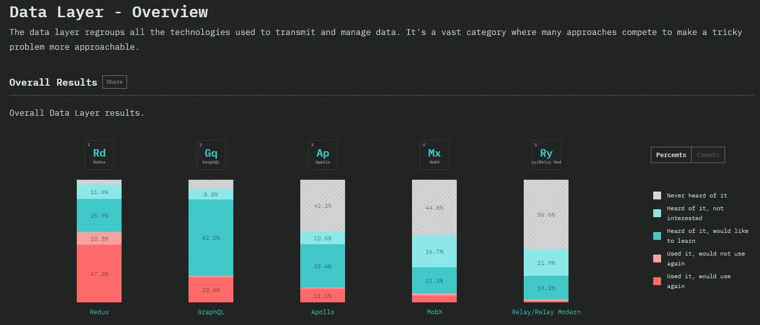 GraphQL 已经被 GitHub 等技术领导者采用。然而,它并没有像一些人预测的那样迅速发展。根据 JS 现状的调查,只有 1/5 的前端开发人员使用过 GraphQL,但是令人吃惊的是,62.5% 的开发人员听说过并希望使用它。