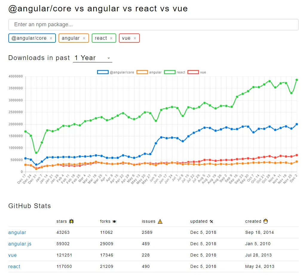 今年 10 月,Angular 发布了另一个重要版本,版本 7 是其流行的 UI 框架。Angular 已经见证了从早期的 AngularJS MVC 架构到更现代的使用组件的 Angular 包的大量成长。随着这种增长,它得到了进一步的采用。