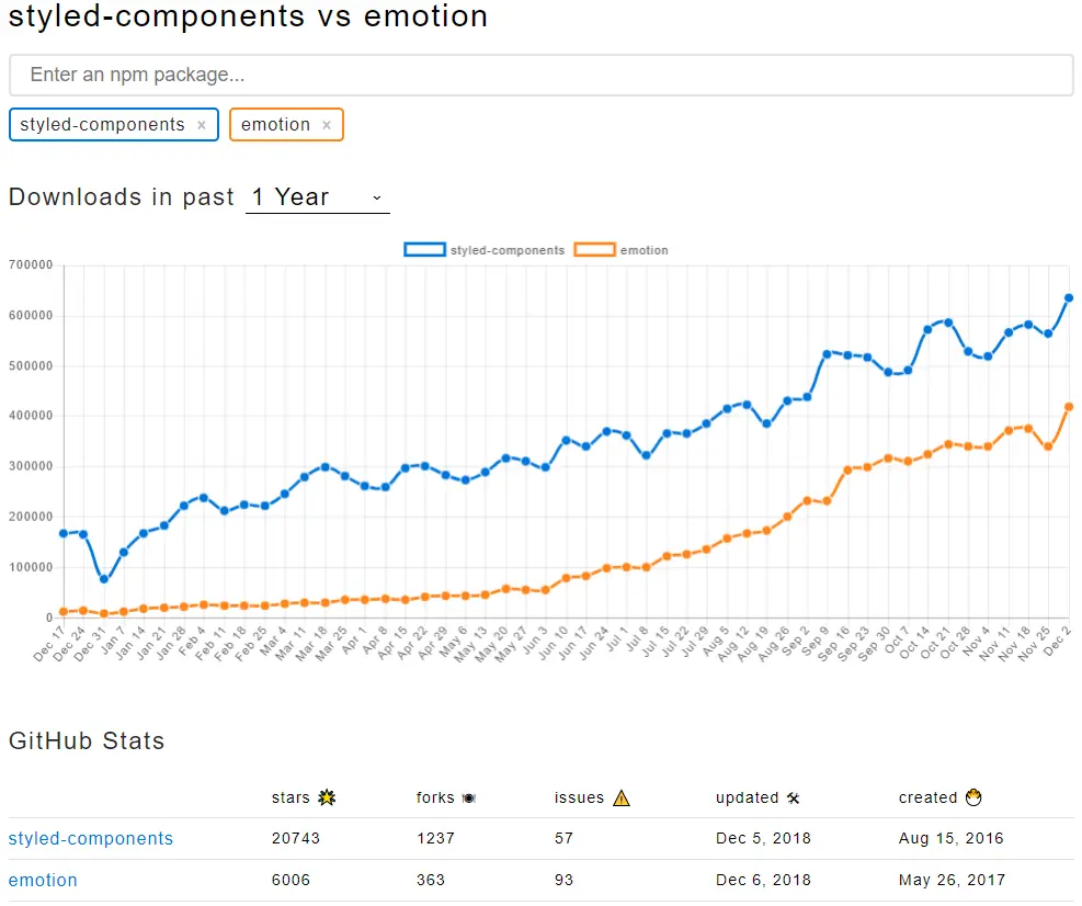 CSS-in-JS 的两个领先的库是 styled-components 和 emotion。styled-components 已经存在了很长一段时间,并且被越来越多的人采用,但是 Emotion 正在迅速得到普及,许多开发人员发现它是首选库。事实上,Kent C. Dodds 甚至不赞成他的 CSS-in-JS 库,因为它很有魅力,更倾向于 Emotion。