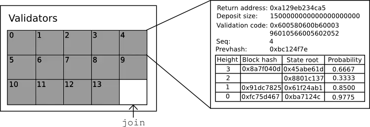 Return address,验证人保证金的返还地址Deposit size,当前验证人保证金的数量(注意验证人的投注会使这个值增加或减少)Validation code,验证人的验证代码Seq,最近一次投注的序号Prevhash,最近一次投注的hash- 验证人的每次投注的表格
