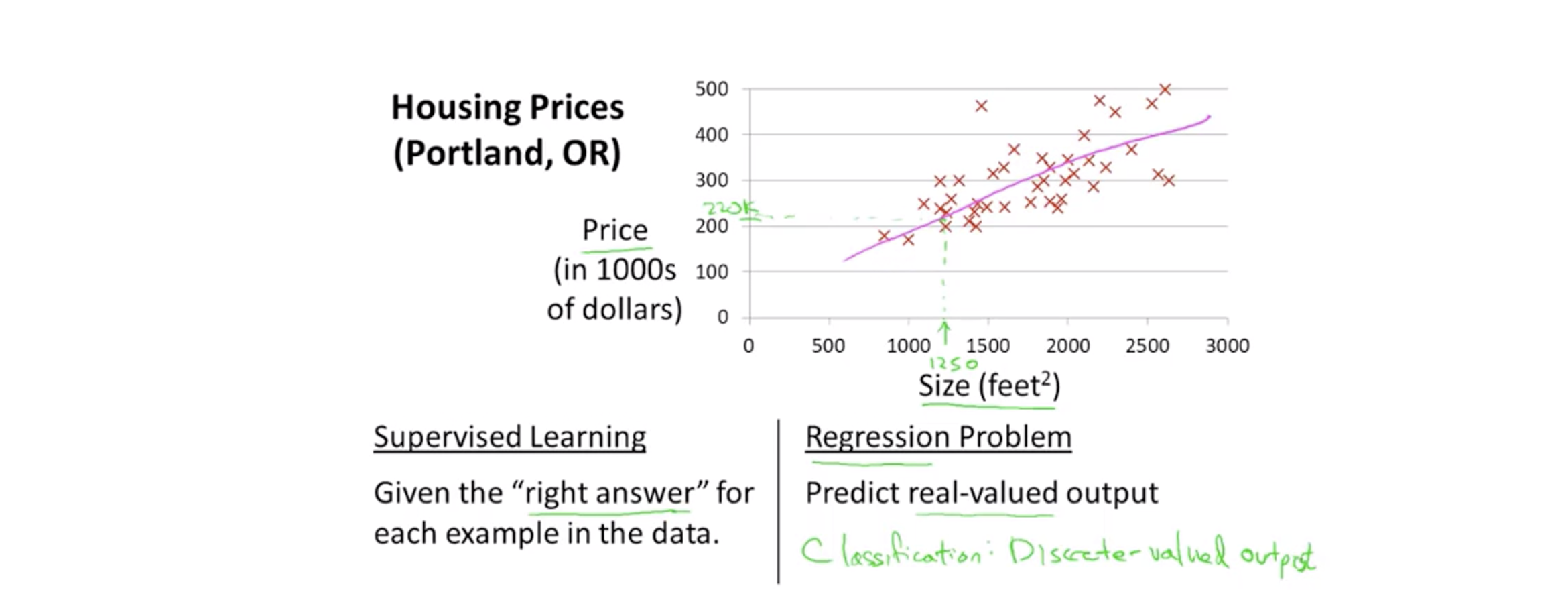 the dataset that we’ll be using to learn—a list of m training examples (x(i),y(i));i=1,...,m—is called a training set. Note that the superscript “(i)” in the notation is simply an index into the training set, and has nothing to do with exponentiation. We will also use X to denote the space of input values, and Y to denote the space of output values. In this example, X = Y = R. To describe the supervised learning problem slightly more formally, our goal is, given a training set, to learn a function h : X → Y so that h(x) is a “good” predictor for the corresponding value of y. For historical reasons, this function h is called a hypothesis. Seen pictorially, the process is therefore like this: