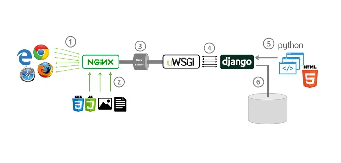 - 绿色模块是Web服务器程序Nginx,Nginx负责解析HTTP协议
