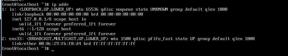 1、查看ip命令ip addr,如果输入命令在ens33中并没有出现ip地址,如下图