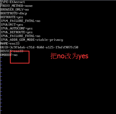 ,就会出现下图的配置信息,我们需要把ONBOOT=no改为ONBOOT=yes即可(编辑,先按esc,输入i回车即可进入编辑模式,把no改为yes后,再按esc,输入:wq回车就保存退出了)