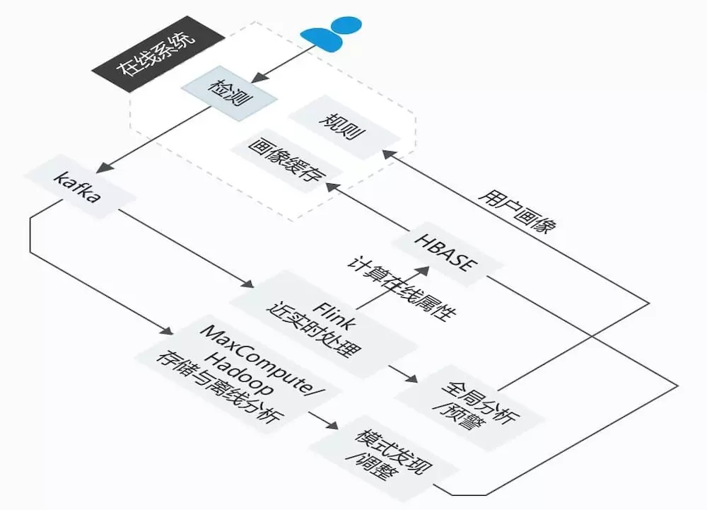 所以这个系统至少要保存三方面的东西,一方面是整个检测的过程,一方面是进行判断的规则,一方面是所需的全局数据,除此之外,根据需要决定是否把用户画像在本地做缓存。 3.2 kafka kafka主要用来把检测的事件、检测的结果、拒绝或通过的原因等数据发送到下游,供流计算和离线计算进行处理。 3.3 flink近实时处理 在上面的系统中已经完成了异常检测,并把决策发送到了kafka,接下来我们需要使用这些数据针对当前的策略进行新一轮的防御性检测。 即使已知的作弊行为已经输入到模型和规则库中进行了标记,但总有“聪明人”尝试欺诈。他们会学习现在的系统,猜测规则并作出调整,这些新的行为很可能超出了我们当前的理解。所以我们需要一种系统来检测整体系统的异常,发现新的规则。 也就说,我们的目标不是检测单个事件是否有问题,而是要检测这些用来检测事件的逻辑本身有没有问题, 所以一定要站在比事件更高的层面来看问题,如果在更高的层面发生变化,那么有理由考虑对规则/逻辑进行调整。 具体来说,系统应该关注一些宏观指标,比如总量,平均值,某个群体的行为等等。这些指标发生了变化往往表示某些规则已经失效。 举几个例子: 某条规则之前的拦截率是20%,突然降低到了5%; 某天规则上线后,大量的正常用户均被拦截掉了; 某个人在电子产品上的花费突然增长了100倍,但同时其他人也有很多类似的行为,这可能具有某种说得通的解释(比如Iphone上市); 某人连续几次行为,单次都正常,但不应该有这么多次,比如一天内连续买了100次同一产品【开窗分析】; 识别某种组合多条正常行为的组合,这种组合是异常的,比如用户买菜刀是正常的,买车票是正常的,买绳子也是正常的,去加油站加油也是正常的,但短时间内同时做这些事情就不是正常的。通过全局分析能够发现这种行为的模式。 业务人员根据流计算产生的近实时结果能够及时发现规则有没有问题,进而对规则作出调整。 除此之外,流计算还能进行用户画像的实时更新更新,比如统计用户过去10分钟的几次行为,最近10次的登陆地点等等。 3.4 maxcompute/hadoop离线存储于探索性分析 在这个环节中,可以通过脚本、sql、或机器学习算法来进行探索性分析,发现新的模型,比如通过聚类算 法把用户进行聚类、对行为打标后进行模型的训练等等,或者周期性的重新计算用户画像。这里和业务关系很大,不多过多描述。 3.5 hbase用户画像 hbase保存着流计算&离线计算产生的用户画像,供检测系统使用。之所以选择hbase主要是为了满足实时查询的需求。