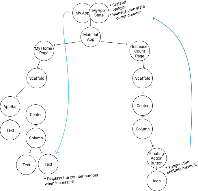 简单来说,这个App的状态是由根Widget提升的,当你点击提交表单,它在inherited widgets调用setState通知主页面有新的信息需要渲染。