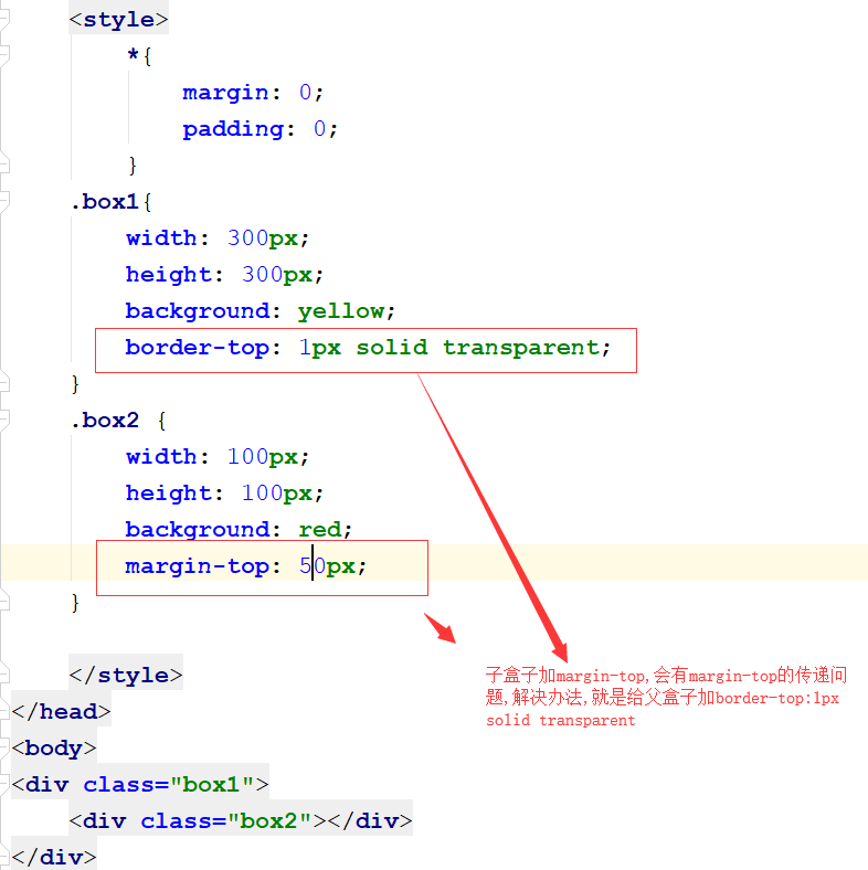 - 给父盒子设置一个border-top:1px solid,给子盒子加margin-top;设置一个上边框,就可以解决,如果不想要颜色,可以设置成一个透明色,transparent