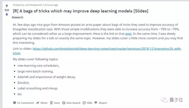 最近,Reddit机器学习版块有人发帖称,自己也整理了各种各样调整改善深度学习模型的方法,比亚马逊的论文中提到的方法还要多。