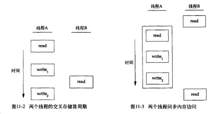 图11-2描述了两个线程读写相同变量的假设例子。 在这个例子中,线程 A 读取变量然后给这个变量赋予一个新的值,但写操作需要两个存储器周期。 当线程 B 在这两个存储器写周期中间读取这个相同的变量时,它就会得到不一致的值。 为了解决这个问题,线程不得不使用锁,在同一时间只允许一个线程访问该变量。 图 11-3 描述了这种同步。 如果线程 B 希望读取变量,它首先要获取锁; 同样地,当线程 A 更新变量时,也需要获取这把同样的锁。 因而线程 B 在线程 A 释放锁以前不能读取变量。 - 线程同步本身是一个相对耗时的过程,如果逃逸分析能够确定一个变量不会逃逸出线程,无法被其他线程访问,那这个变量的读写肯定就不会有竞争,对这个变量实施的同步措施也就可以消除掉。