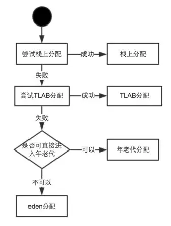 1. 编译器通过逃逸分析,确定对象是在栈上分配还是在堆上分配。如果是在堆上分配,则进入选项 2.如果 tlab_top + size <= tlab_end,则在在 TLAB 上直接分配对象并增加 tlab_top 的值,如果现有的 TLAB 不足以存放当前对象则 3.重新申请一个 TLAB,并再次尝试存放当前对象。如果放不下,则 4 4.在 Eden 区加锁(这个区是多线程共享的),如果 eden_top + size <= eden_end 则将对象存放在 Eden 区,增加 eden_top 的值,如果 Eden 区不足以存放,则 5 5.执行一次 Young GC(minor collection)。 6. 经过 Young GC 之后,如果 Eden 区仍然不足以存放当前对象,则直接分配到老年代。