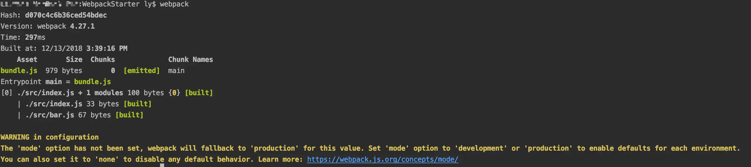 注意 bar.js 和 index.js 是在 src 文件夹下的,而 index.html 和 webpack.config.js 是在根目录下。webpack.config.js 顾名思义就是 wepack 的配置文件,另外 3 个就是源文件了。然后在根目录下愉快的悄下我们的 webpack 命令,最后输出如下的结果。