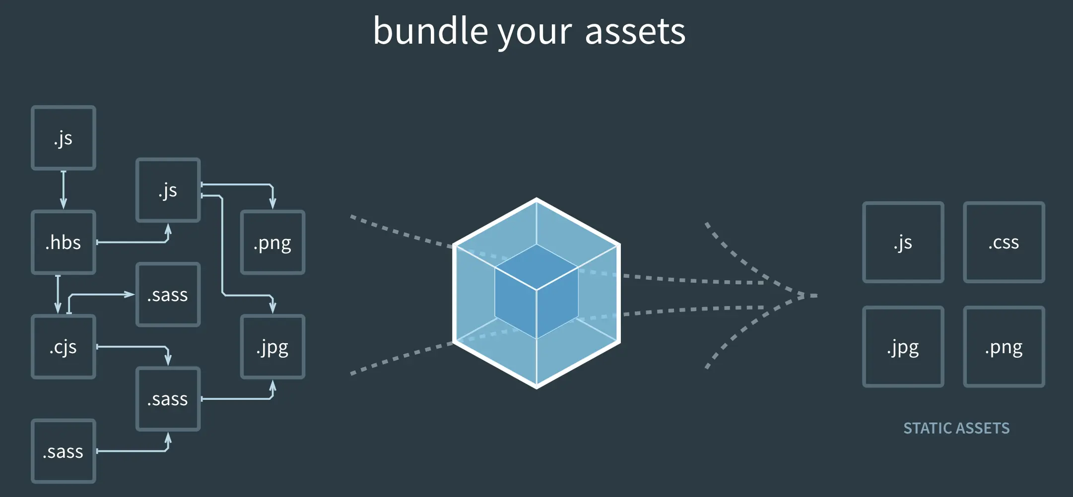 什么是 webpack 呢?如下,一图胜千言,就是将左边的各种资源进行整合,压缩甚至是混淆等种种操作后,最后打包成右边的图示几个通用的纯粹的 js css jpg png 等。懒得理解了,就把它看成是 Android 中的 gradle 吧。