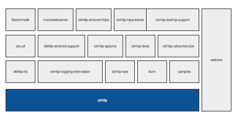 从上图看 OKHttp 的核心实现库就是 okhttp 工程。作为一个优秀的框架,一定不是孤立地存在的,还有它身边的辅助工程,demo 工程等等。如下是整个工程模块的分类及简要说明。