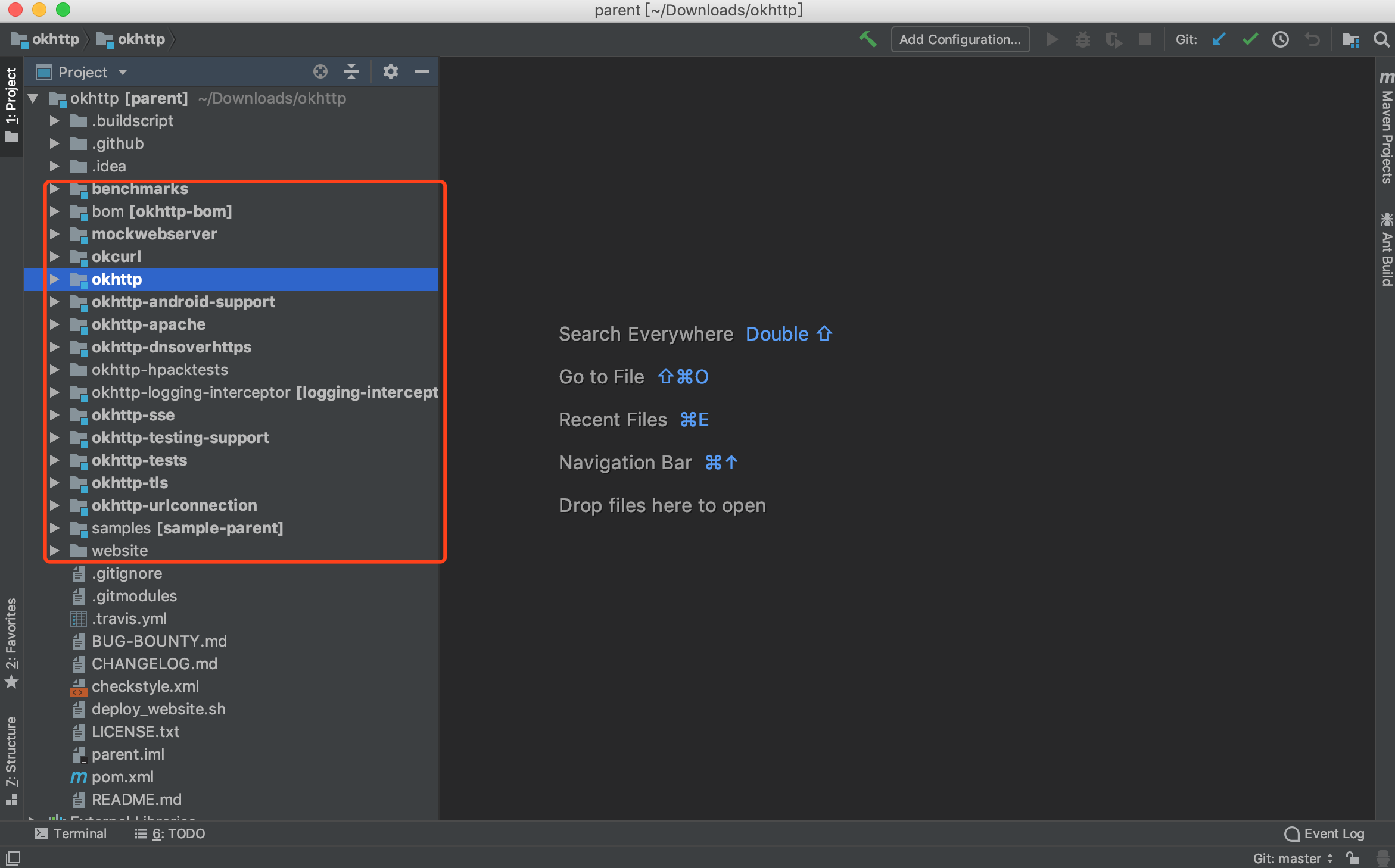 当我们 clone 下 OkHttp 的 github 仓库下来,会发现其里面含有非常多的小工程,这其实是一个大的 maven 工程。如果要工程化的管理以及调试,建议用 IntelliJ IDEA 或者 Eclipse 打开工程,而不要用 Android Studio 打开,最后得到的效果如下图。如果打开的下图这个样子,你就可以进行愉快的代码调式了。当然手头最好还是准备一个衬手的抓包工具,如 charles,fiddler 或者 更牛逼的 Wireshark。