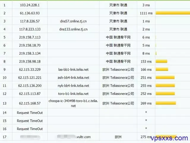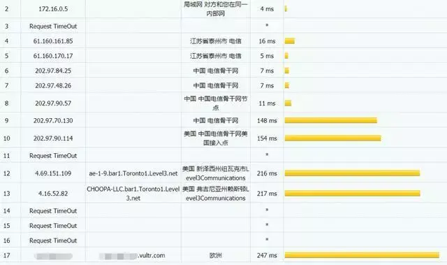 平均ping值238ms,这算非常好的了,一般加拿大机房有这个延迟证明没有绕路,不信具体看看路由图: