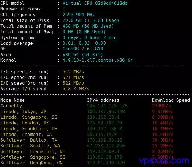 首先看一下硬件配置,如图所示,这是月付3.5美元的配置,其实月付2.5美元的和这个一样,只是月付2.5美元的没有独立IPv6只有IPv6而已。1核CPU配上512M的内存,默认没有虚拟内存。20G的硬盘读写速度非常不错,平均值超过500MB/s,国外测试点的下载速度也不错。看下国内下载速度: