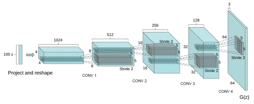 现在利用小步长卷积作为基础,我们可以实现G(z)函数,让它接收一个的向量输入,然后输出一张尺寸是 64x64x3 的彩色图片,其网络结构如下图所示: