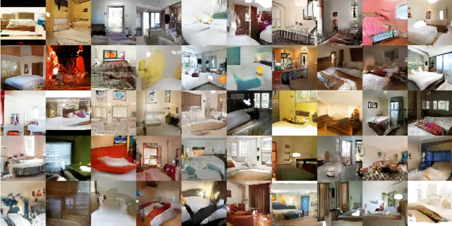 现在先让我们暂停并欣赏下这种G(z)网络结构的强大,在 DCGAN 论文中给出了如何采用一个卧室图片数据集训练 一个 DCGAN 模型,然后采用G(z)生成如下的图片,它们都是生成器网络 G 认为的卧室图片,注意,下面这些图片都是原始训练数据集没有的!