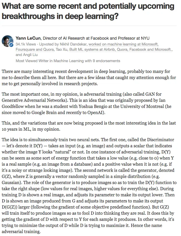 Yann LeCun 在回答中简单介绍了 GAN 的基本原理,也就是两个网络相互博弈的过程。