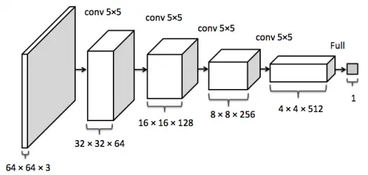 接着介绍下判别器(discriminator,D)网络,它是输入一批图片x,然后返回该图片来自训练数据的概率。如果来自训练数据,D 应该返回一个接近 1 的数值,否则应该是一个接近 0 的值来表示图片是假的,来自 G 网络生成的。在 DCGANs 中,D 网络是一个传统的卷积神经网络,如下图所示,一个包含4层卷积层和1层全连接层的卷积神经网络结构。