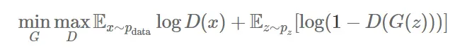 正如论文提到的,训练对抗网络就如同在实现一个最小化最大化游戏(minimax game)。如下面的公式所示,第一项是对真实数据分布的期望,第二项是对生成数据的期望值。