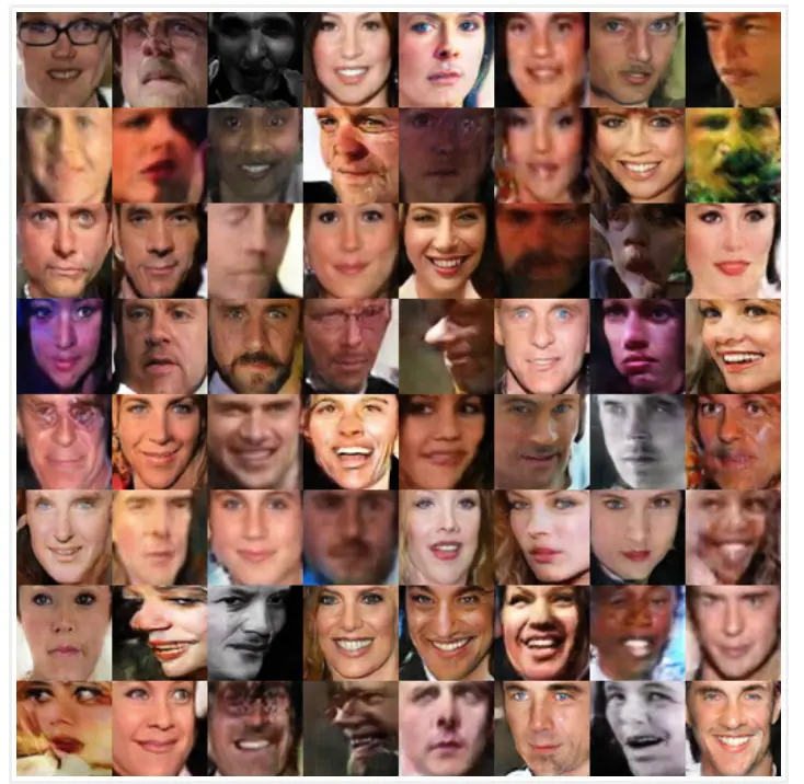 在samples文件夹中可以查看保存的由 G 生成的图片。这里作者是采用手上有的两个数据集 CASIA-WebFace 和 FaceScrub 进行训练,并在训练 14 个 epochs 后,生成的结果如下图所示: