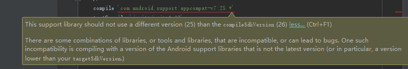 com.android.support:appcompat-v7:26.+这个声明很重要。如果版本低了,可能低了一个版本却可以编译,这说明是你没用到高级版增加的内容,但是AS会提示你这样是不好的,应该设置成一致的。