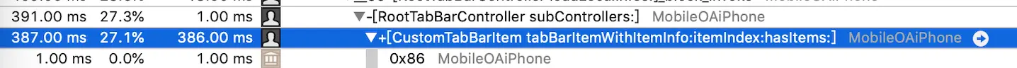 通过TimeProfiler的结果一目了然,在CustomTabBarItem里面做了什么用了387ms。可以在工具里面直接右键进入到到这段耗时代码的位置。我总共测试了五个tabbar渲染item图片的耗时: