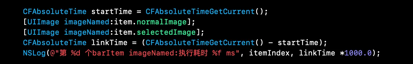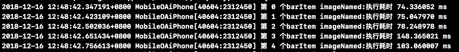 看打点日志就很恐怖了,执行两个imageName:就消耗了主线程差不多100ms的时间,五个tabbar那就是500ms的时间,显然这就是上面效果图出现白屏的原因了,实际上imageName:是会对图片进行解码之后再渲染的。