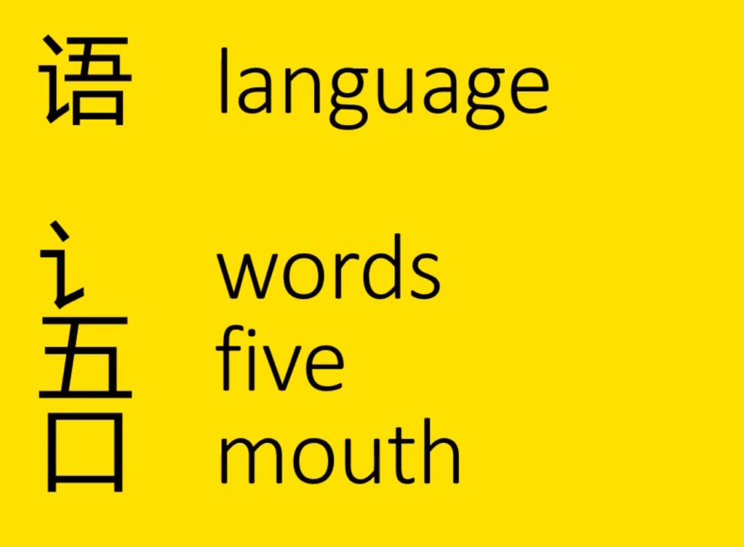 语 language = words 讠+ five 五+ mouth 口