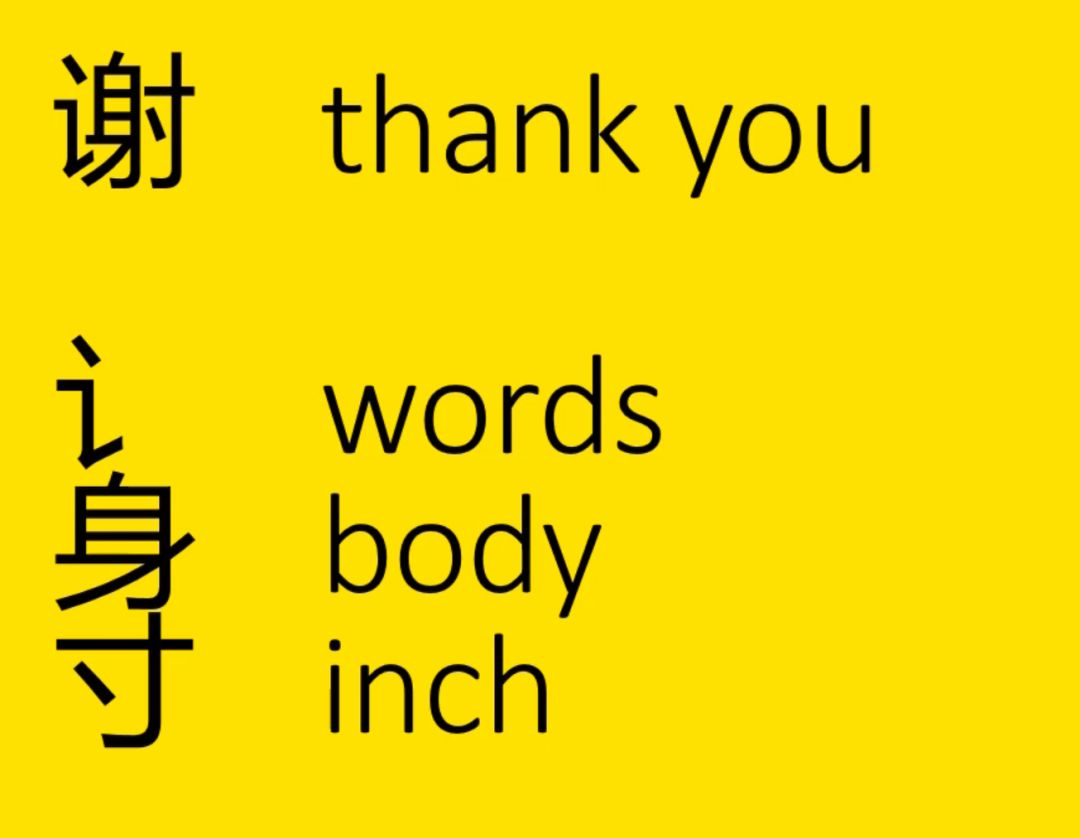 谢 thank you = words 讠+ body 身+ inch 寸