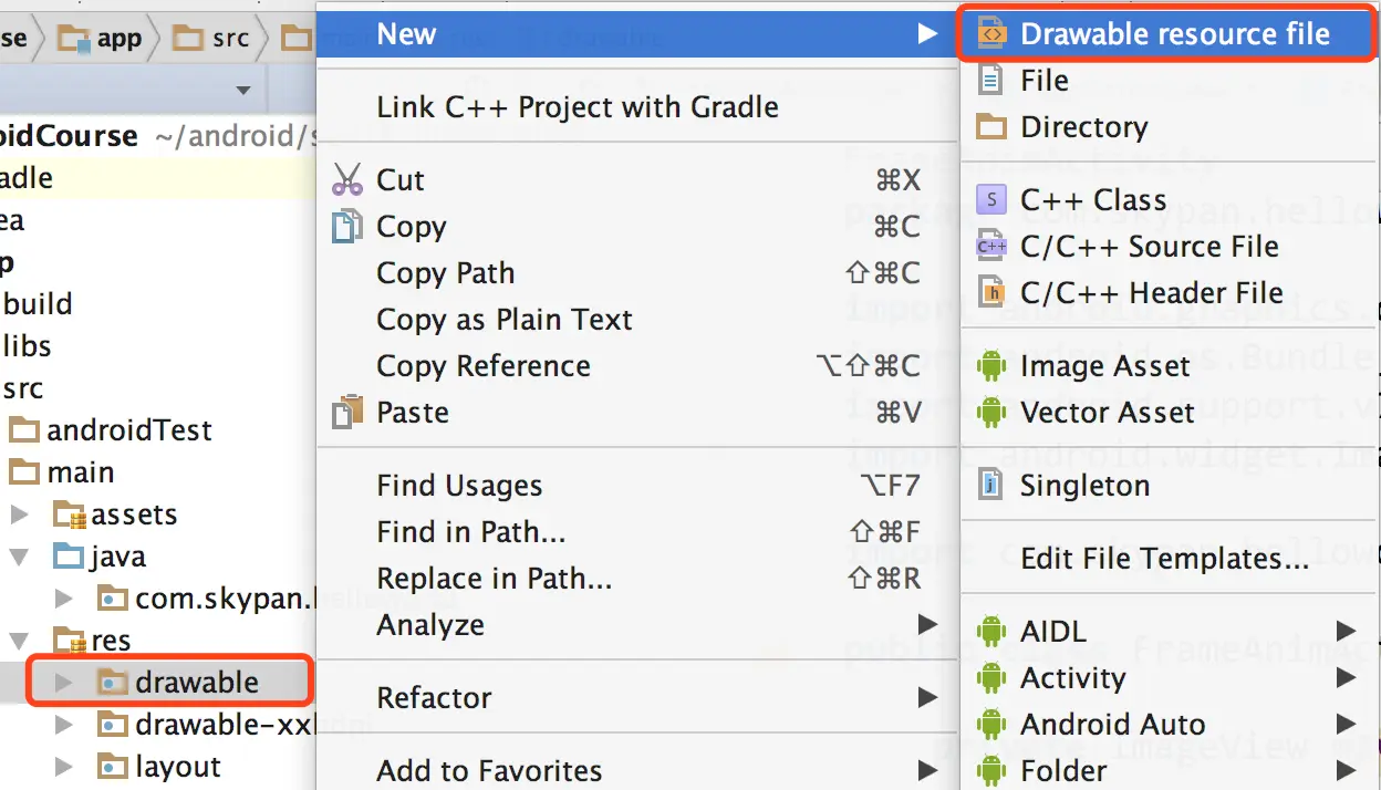 首先我们将制作好的8张图片放到项目目录 res/drawable-xxhdpi 下面(没有这个文件夹的话可以新建一个),然后在 drawable 文件夹下新建一个动画 xml 文件。