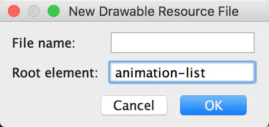 输入文件名,比如 progress_round,Root element 选择 animation-list
