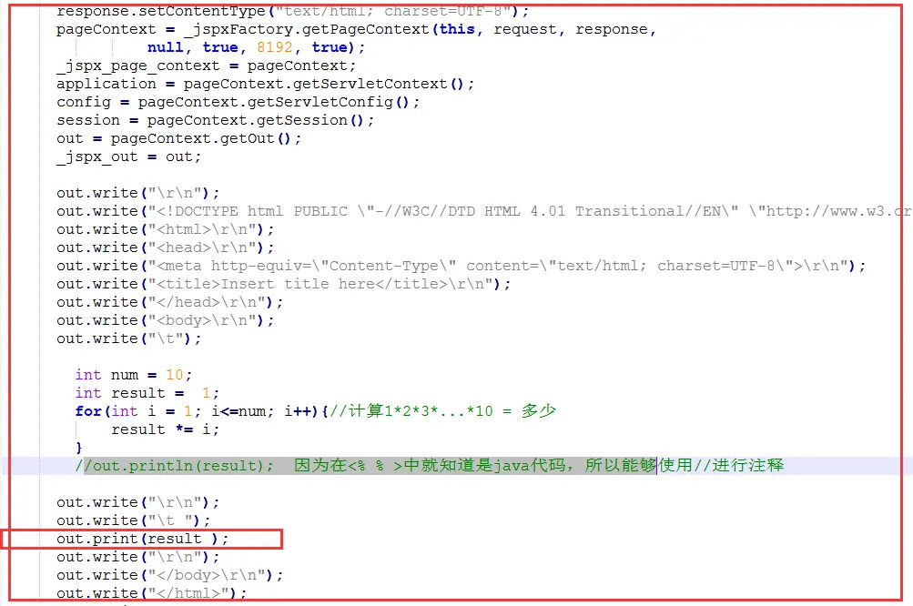 使用<%=result %>来输出结果,servlet中就会将其转换为out.print(result)进行输出。输出各种类型数据:int、double、boolean、String、Object等。