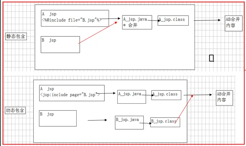 include指令会将包含页面的源代码添加到使用include指令的页面中来,然后编译成class文件,而等下会讲到的一个JSP行为,<jsp:include page="relativeURL">作用跟include指令一样,但是不同的是,include行为是运行时单独执行包含页面,然后把执行的结果包含到本页面来,属于先运行后包含。