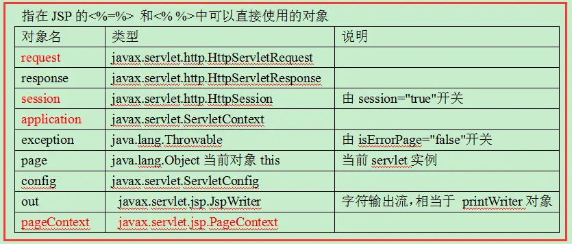 注意:标记了红色的对象就是JSP独有的,其他的都是Servlet中的老东西。