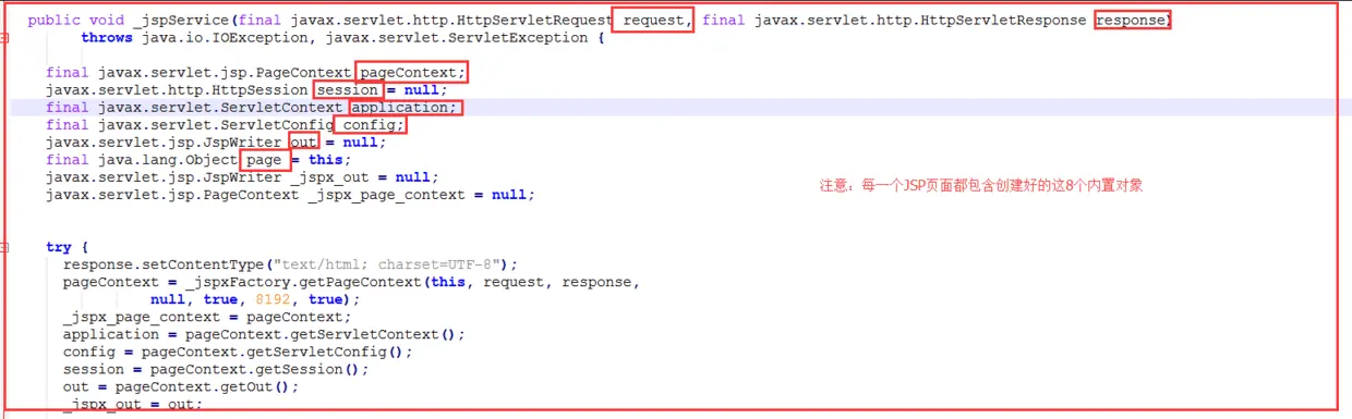 在这个由jsp转换为servlet的文件中,只能看到8个内置对象,少了exception对象,因为我们在将page指令时,说过一个isErrorPage属性,默认是false,被关闭了,所以其中并没有exception对象。