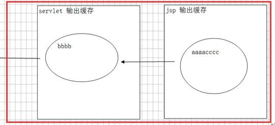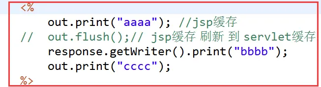 分析: 如果按没有jsp缓存和servlet缓存的话,输出的结果应该是aaaabbbbcccc,但是输出的却是bbbbaaaacccc,为什么呢?按照我们上面所说的原理进行分析,out对象是先将其输出到JSP缓存中,所以aaaa加入了jsp缓存,而response.getWriter().print("bbbb")是直接将bbbb输出到servlet缓存中,然后又使用out对象将cccc输出到jsp缓存,到程序结束,servlet缓存中有bbbb,然后jsp会将缓存中的内容就刷新到servlet缓存中,serlvet就是bbbbaaaacccc了,然后到浏览器也就得到我们的输出结果了。如果在12行将注释去掉,那么输出的结果又会是什么呢?答案就是aaaabbbbcccc,过程自行分析。