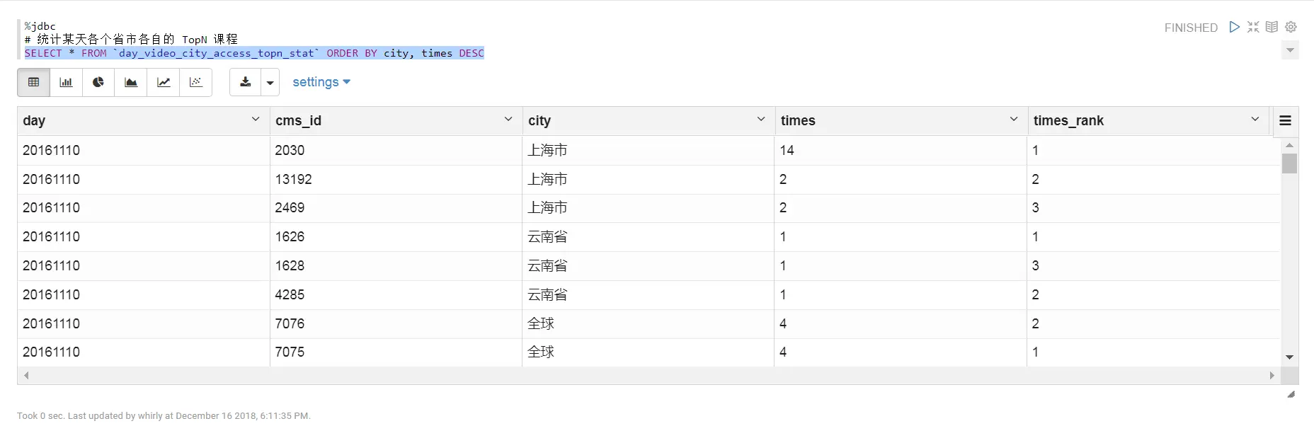 7、 zeppelin 可导入 最受欢迎的TopN课程.json 文件查看结果,也可以使用可视化方案,譬如echarts、highcharts、D3.js、HUE等等...