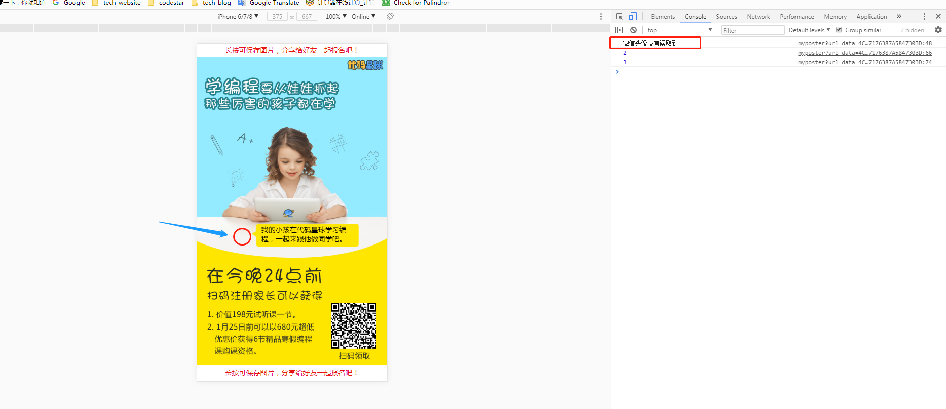 2.异步处理可以涉及很多内容,笔者自己也不是特别懂,此处不展开讲,下次专门出一篇异步的博客。此处处理将替换头像地址,生成动态二维码,canvas绘图按照前中后三步顺序执行,(没有做异步处理时,safiri中生成canvas比生成头像和生成二维码都快,导致最后的整图没有微信头像和二维码。)