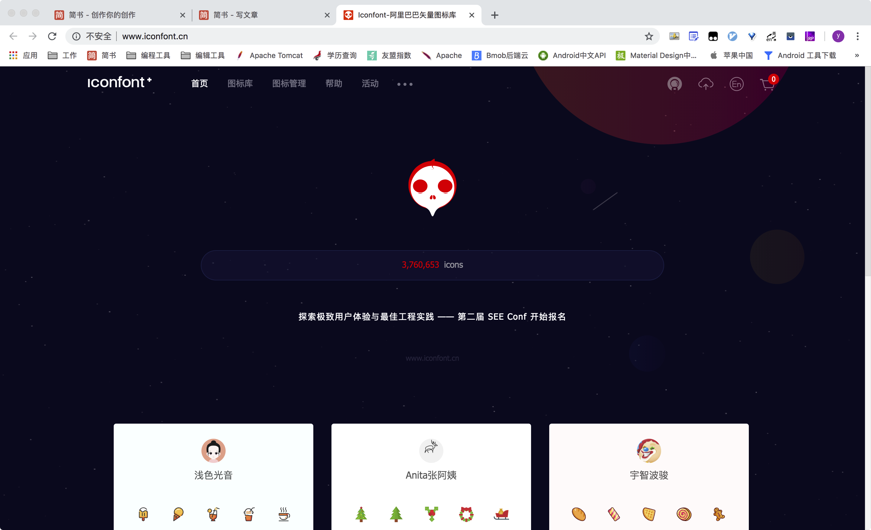 最近项目中要添加表情包聊天的功能(文本和表情包要混合在一起),最直接的解决方案应该就是图文混排,对于这个方案网上有很多的实现,图文混排实现起来比较麻烦,而且和服务端交互的时候还要将图片和与之对应的字符串之间进行变换,对于有追求的我来说,这个方案我是无法接受的,因此直接被否定;表情包是用来聊天的,如果每一个表情包可以看着是一个英文字符,那样实现起来岂不是完美,既不用考虑与服务端的交互,也不用像图文混排那样写自定义的图文混排控件(直接使用TextView和EditText就行),那么用表情包图片生成与之对应的字体库就是最好的解决方案,第一时间想到的就是iconfont,如下图所示: