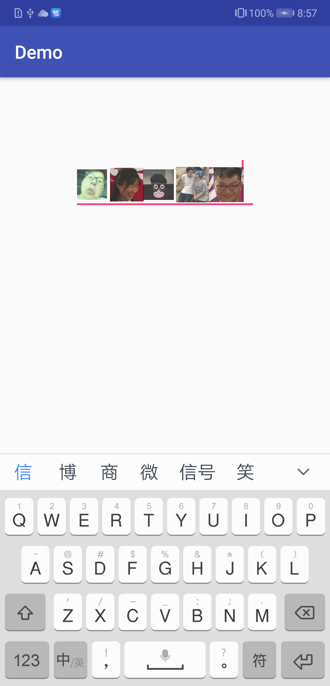 上面截图中就是一个普通EditText控件,只不过是应用了2中生成的字体库,当输入傻、吻、嘿、微和白五个汉字时,就会显示上面的五张图片。
