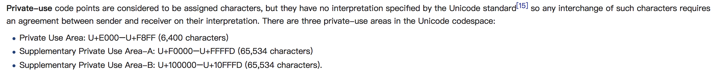 注意:Unicode编号不能随便使用,因为有的编号已经被占用了,就像上面的例子中的五个汉字对应的编号就被占用了,所以就要知道那些范围的编号是可以自定义用的,用这个范围的编号作为表情包的编号就是安全的,下面是维基百科上给出的可以自定义编号的范围: