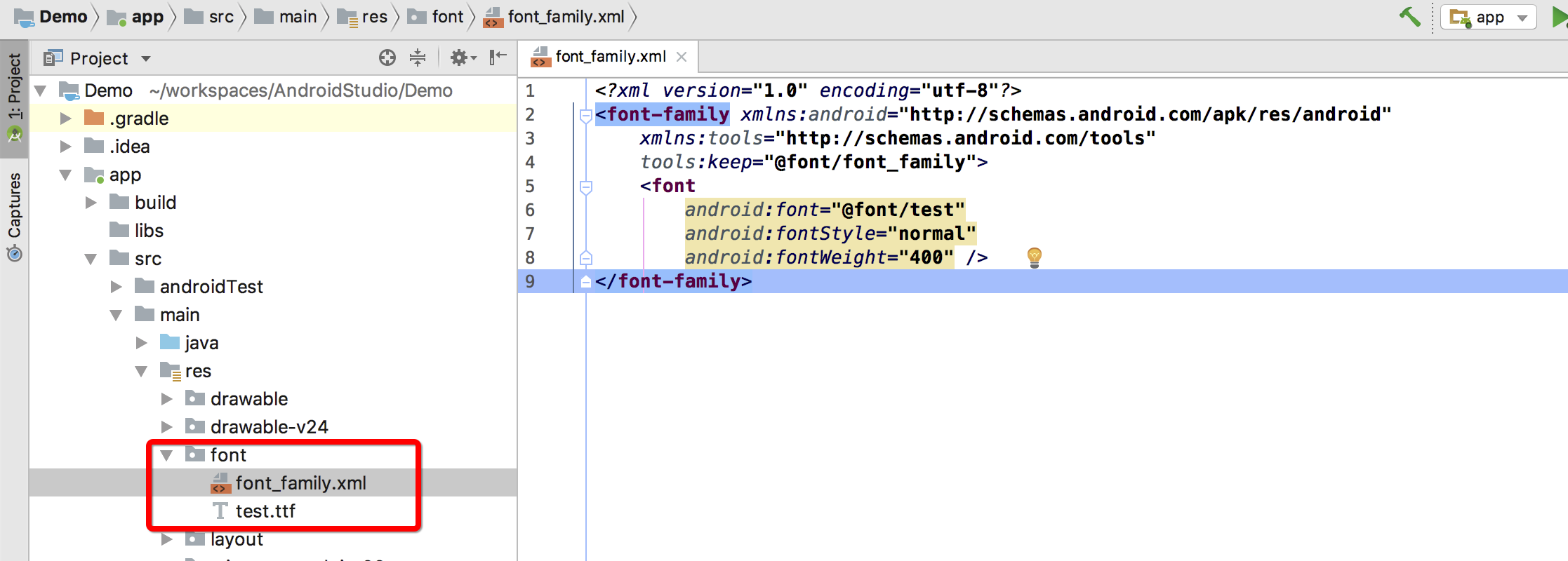 android:fontFamily="@font/test"/>