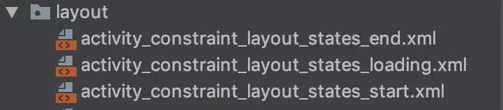 在xml资源文件夹中,创建包含状态的xml文件。 在此示例中,我们将其称为constraint_layout_states_example.xml 。 在此文件中放置布局的所有不同表示。 给他们有意义的id,如start , loading等,然后将它们链接到相关的约束文件。