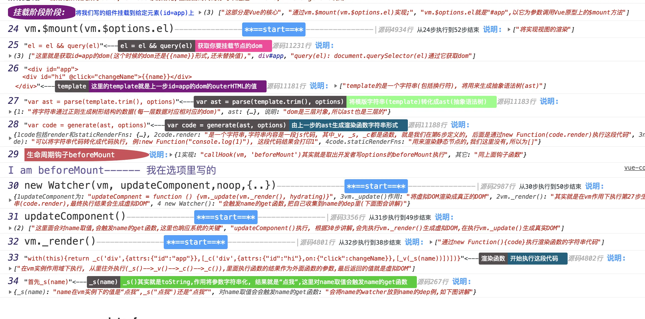 我将整个过程分为四个阶段: 构造函数阶段、初始化阶段、挂载阶段 、更新阶段,